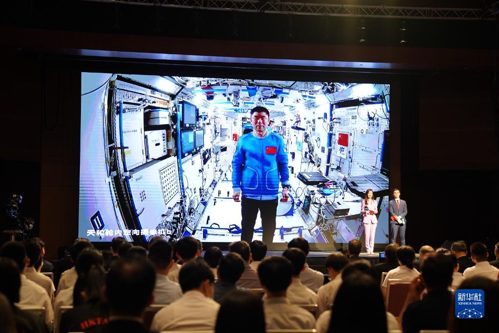 9月3日,正在天宮空間站執行任務的神舟十二號乘組與香港科技工作者、教師和大中學生進行天地連線互動。新華社記者 呂小煒 攝