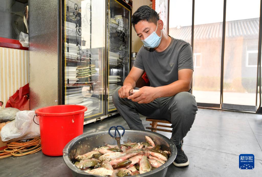在天津市寶坻區黃莊鎮小辛碼頭村,李超清理村民在潮白河里捕到的河魚(9月3日攝)。新華社記者 孫凡越 攝