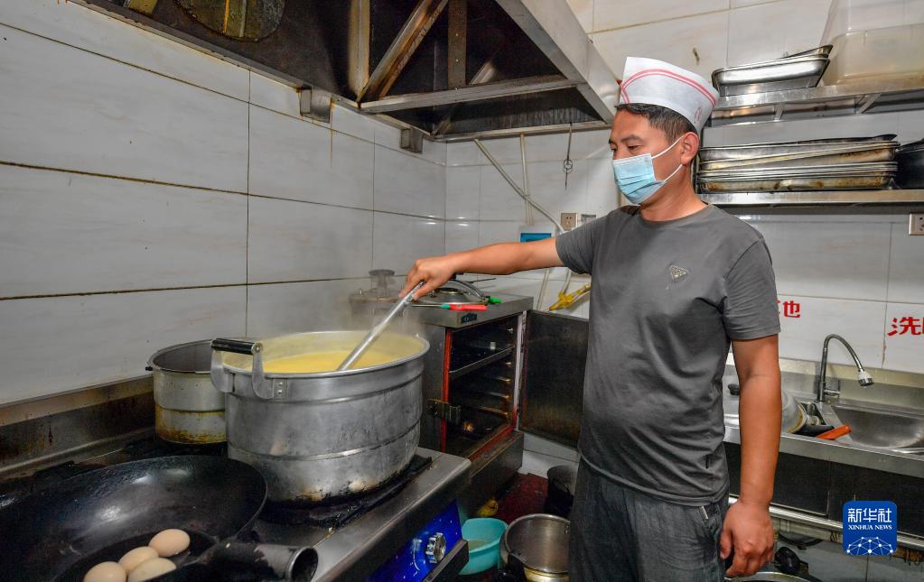 在天津市寶坻區(qū)黃莊鎮(zhèn)小辛碼頭村,李超為客人準備早餐(9月3日攝)。新華社記者 孫凡越 攝