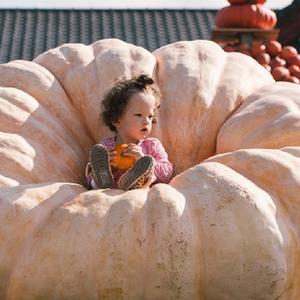 9月12日,在德國洛馬爾傳統南瓜節上,一名兒童在一個巨型南瓜上留影。