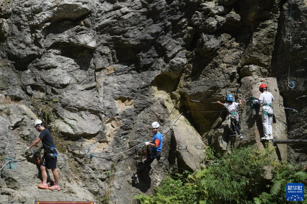10月2日,在貴陽(yáng)市開(kāi)陽(yáng)縣南江大峽谷,游客在安全員的陪護(hù)下體驗(yàn)攀巖。