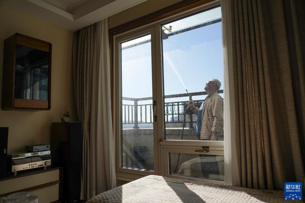 10月12日,在位于河北燕郊的燕達金色年華健康養護中心居家式養老公寓里,呂偉業在陽臺上打掃衛生。