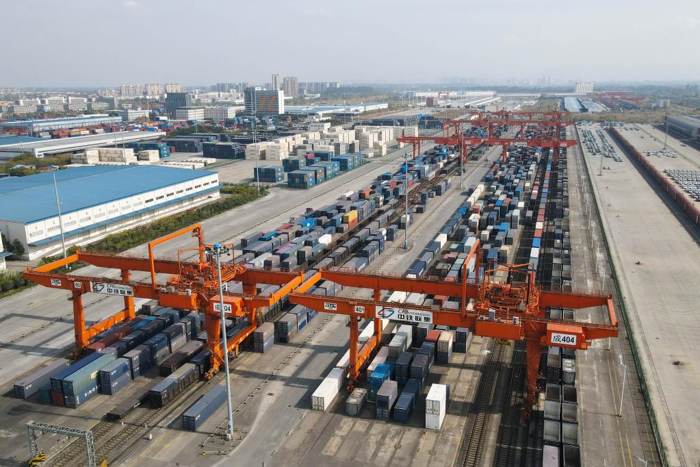 這是11月23日拍攝的四川省成都市青白江區(qū)的成都國(guó)際鐵路港(無(wú)人機(jī)照片)。新華社記者胥冰潔攝