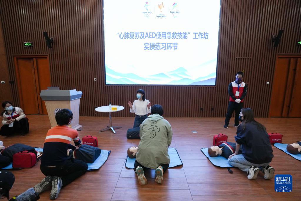 11月28日,清華大學醫院醫生李晶鈴(后)為學生志愿者講授心肺復蘇術。新華社記者 鞠煥宗 攝