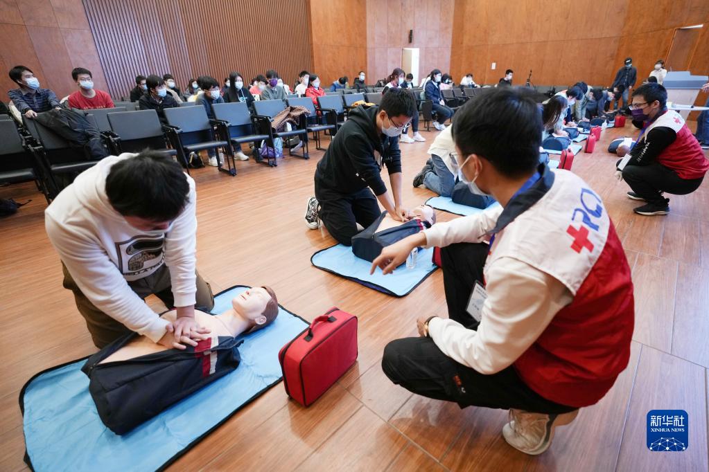 11月28日,冬奧學生志愿者在急救技能培訓上學習心肺復蘇術。新華社記者 鞠煥宗 攝