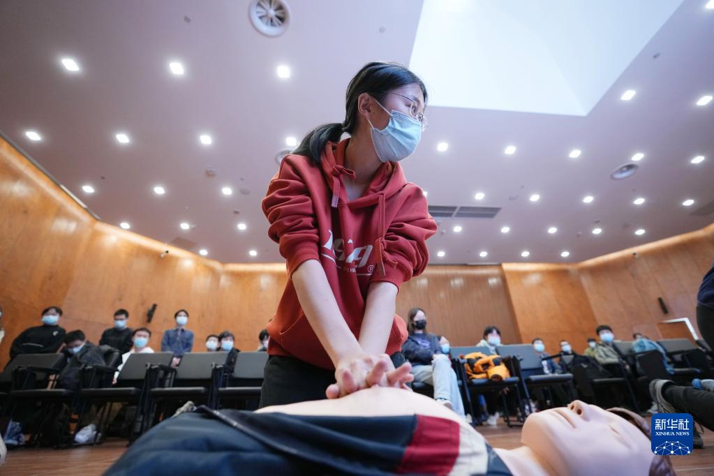 11月28日,清華大學(xué)計(jì)算機(jī)系的冬奧學(xué)生志愿者王昊華在急救技能培訓(xùn)上學(xué)習(xí)心肺復(fù)蘇術(shù)。新華社記者 鞠煥宗 攝