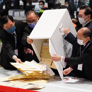 12月19日,香港特區選舉管理委員會主席馮驊(右二)打開票箱。新華社記者 呂小煒 攝