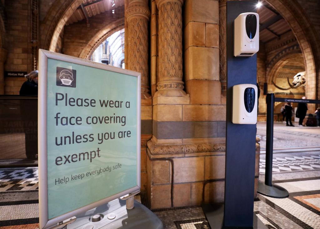這是12月18日在英國倫敦自然歷史博物館門口拍攝的提醒人們佩戴口罩的提示牌。(新華社記者李穎攝)