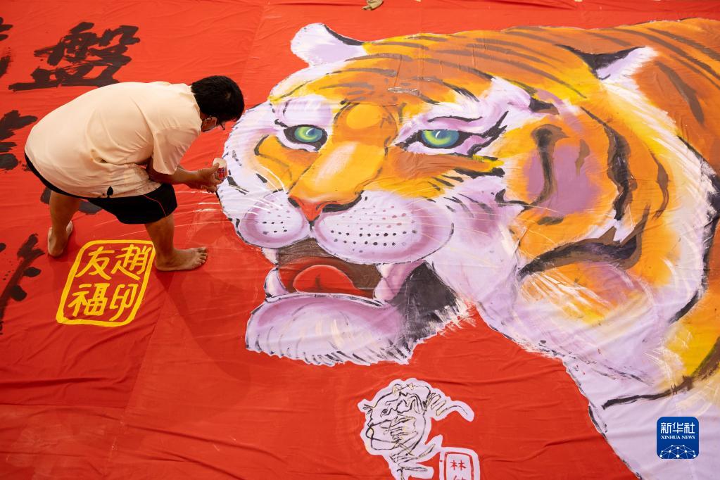 為迎接農歷虎年的到來,文冬當地一家華人團體邀請畫家和學生一起創作了一幅11.5米長、4.5米寬的老虎年畫。新華社發(張紋綜攝)