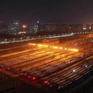 1月16日晚,動車組列車停靠在中國鐵路蘭州局集團有限公司蘭州車輛段蘭州西動車運用所整備場上,為1月17日開始的2022年春運做好準備(無人機照片)。新華社記者 杜哲宇 攝