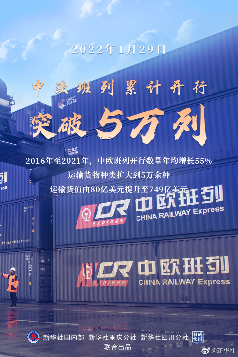 新華社北京1月29日電 記者從中國國家鐵路集團有限公司獲悉,1月29日晨,隨著中歐班列X8086/5次從成都城廂站開出,中歐班列累計開行突破5萬列,“跑”出開行“新里程”。