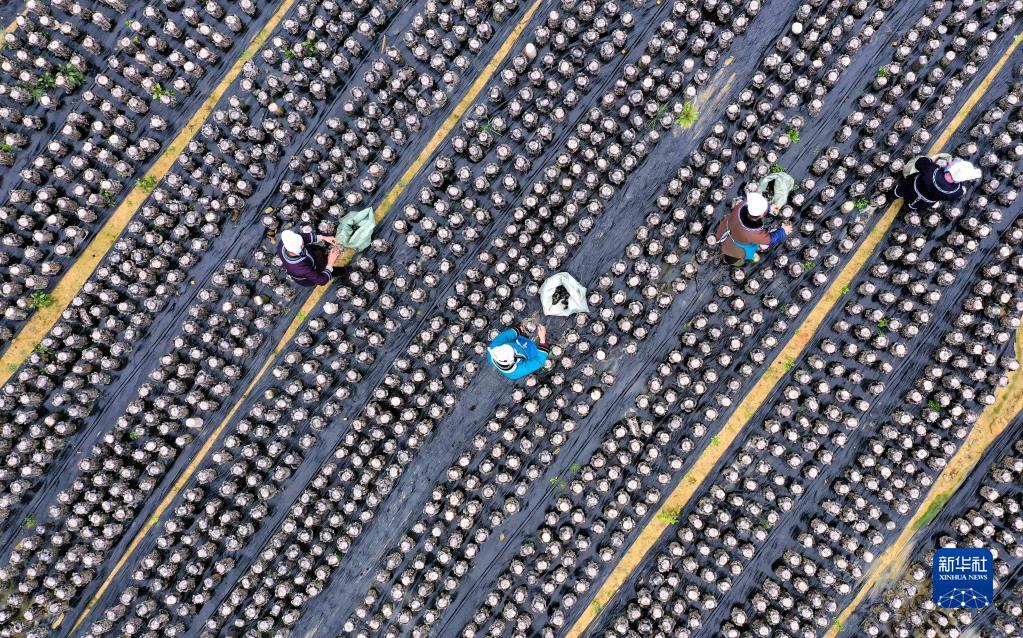 2月11日,村民在貴州省黔東南苗族侗族自治州榕江縣興華水族鄉(xiāng)高舊村采摘黑木耳(無人機照片)。