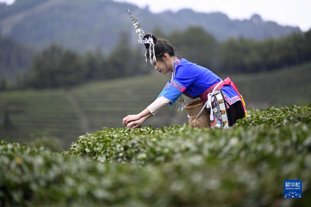 2月10日,在廣西柳州市三江侗族自治縣古宜鎮光輝村馬灣茶場,一名侗族姑娘采摘早春茶。