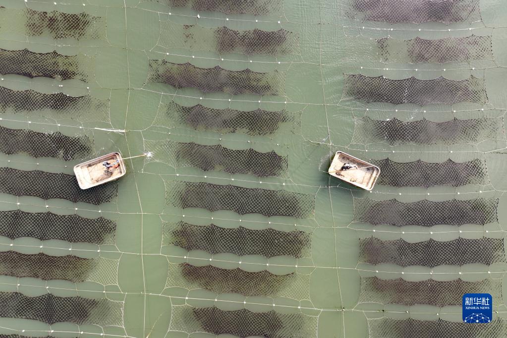 2月10日,江蘇省連云港市贛榆區(qū)沿海紫菜養(yǎng)殖戶在管理紫菜(無人機拍攝)。