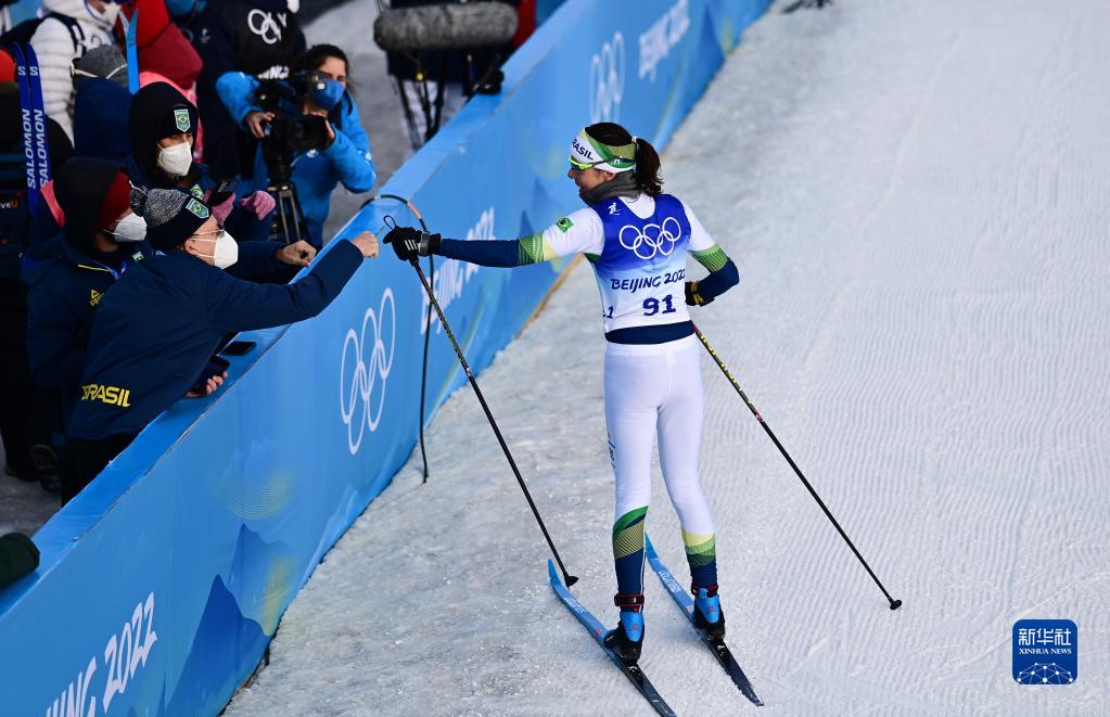 在北京冬奧會張家口賽區國家越野滑雪中心,雅克利娜·莫朗與巴西隊工作人員、隊友相互致意(2月10日攝)。新華社記者 張宏祥 攝