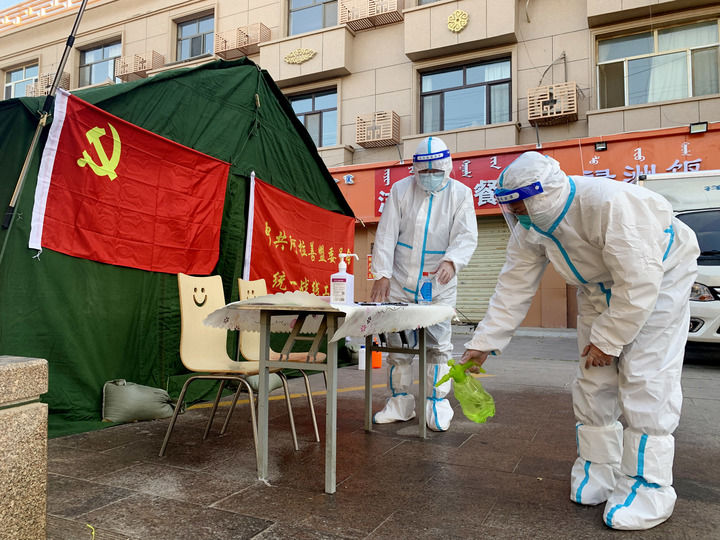 中共阿拉善盟委統戰部兩名黨員在額濟納旗一小區執勤點消毒(2021年10月28日攝)。新華社記者 王靖 攝