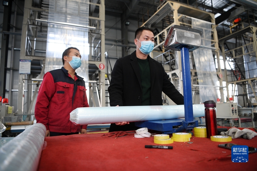 2022年1月28日,閩商鄭開煌(右)在位于寧夏隆德縣閩寧扶貧產業園的農用薄膜生產線查看產品質量。新華社記者 王鵬 攝