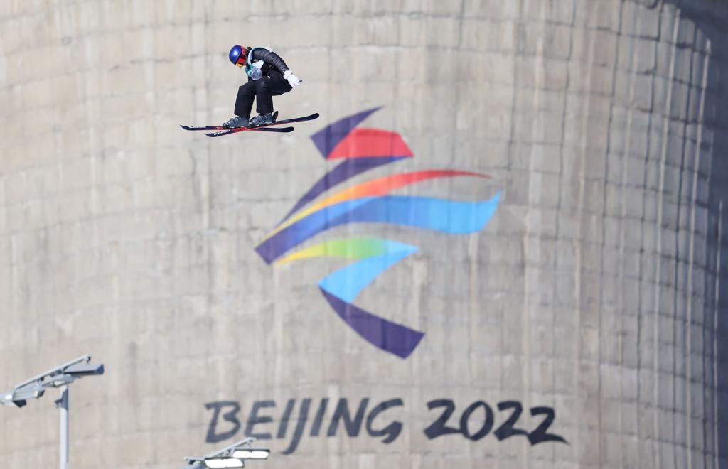 2月8日,中國選手谷愛凌在比賽中。她的空中姿勢和“冬”字形會徽十分相似。新華社記者蘭紅光攝