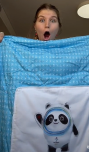 美國運動員展示“冰墩墩”毯子(網絡視頻截屏)