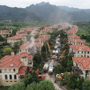 大型機械在陜西省西安市長安區秦嶺違建別墅群“群賢別業”內進行拆除工作(2018年9月6日攝,無人機照片)。新華社記者 邵瑞 攝
