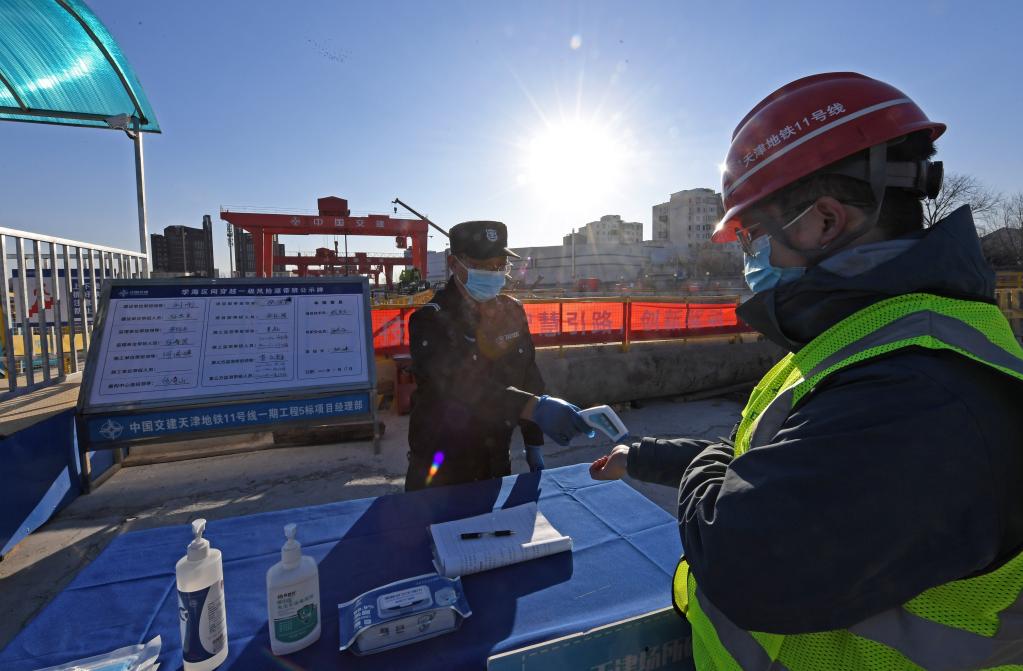 圖為1月17日,天津地鐵11號線5標段項目部,疫情之下地鐵建設不停歇,工作人員進入隧道前接受體溫檢查。新華社記者 趙子碩 攝