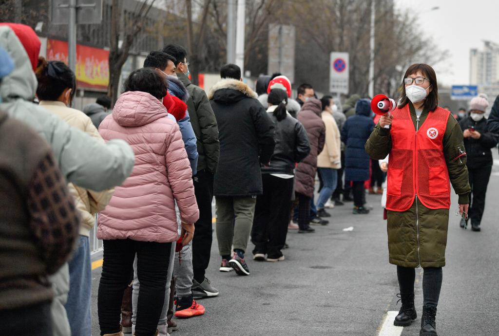 圖為1月9日,在天津市南開區鼓樓街道一處核酸檢測點,志愿者(右)用廣播喇叭提示市民核酸檢測注意事項。新華社記者 孫凡越 攝