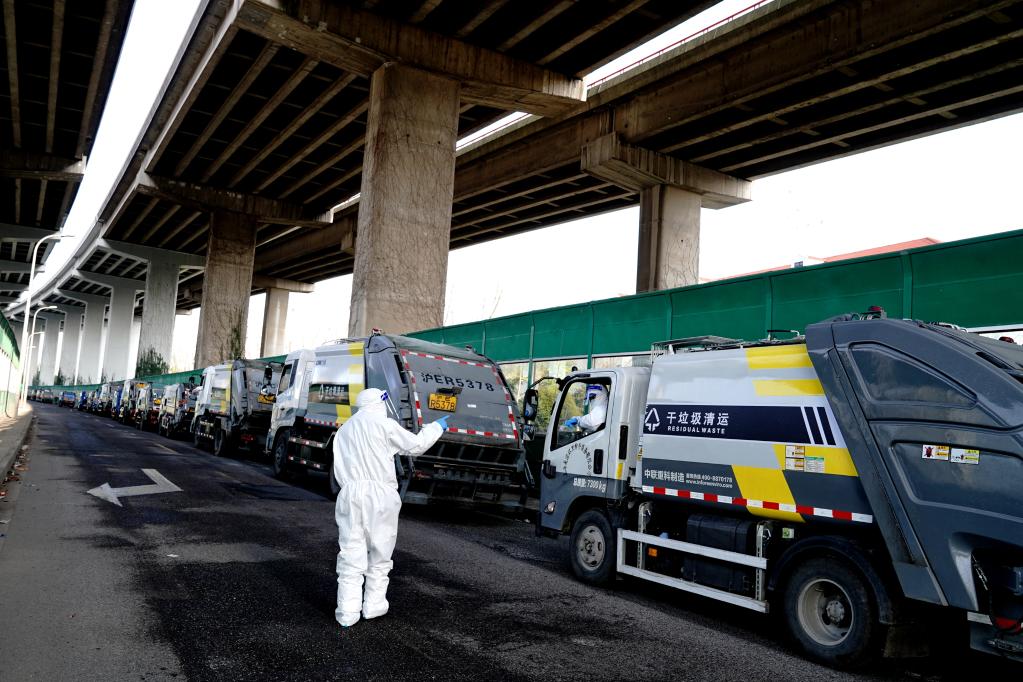 圖為3月23日,上海閔行區吳涇環衛公司垃圾清運車排隊前往隔離垃圾處置場。上海對封控場所內的垃圾“日產日清”。新華社記者 張建松 攝