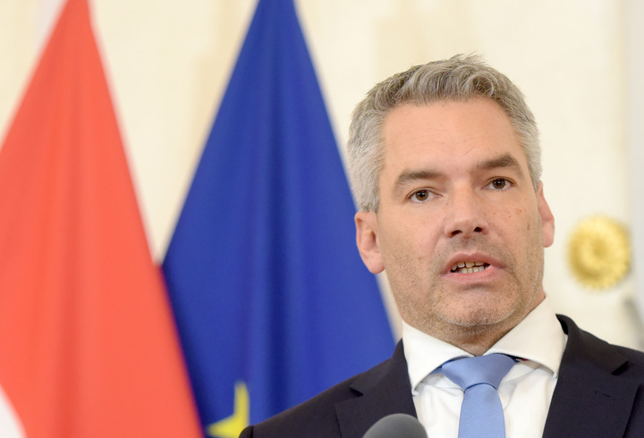 2021年12月6日,在奧地利首都維也納,內(nèi)哈默在交接儀式上致辭。奧地利聯(lián)邦政府當(dāng)天進(jìn)行改組,內(nèi)哈默出任新總理。新華社記者郭晨攝