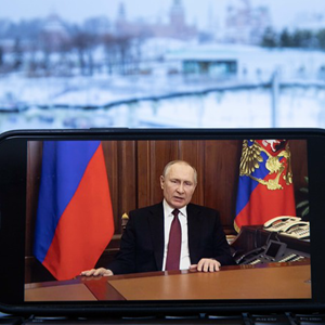 這是2月24日在俄羅斯首都莫斯科拍攝的俄總統(tǒng)普京發(fā)表電視講話的畫面。新華社記者白雪騏攝