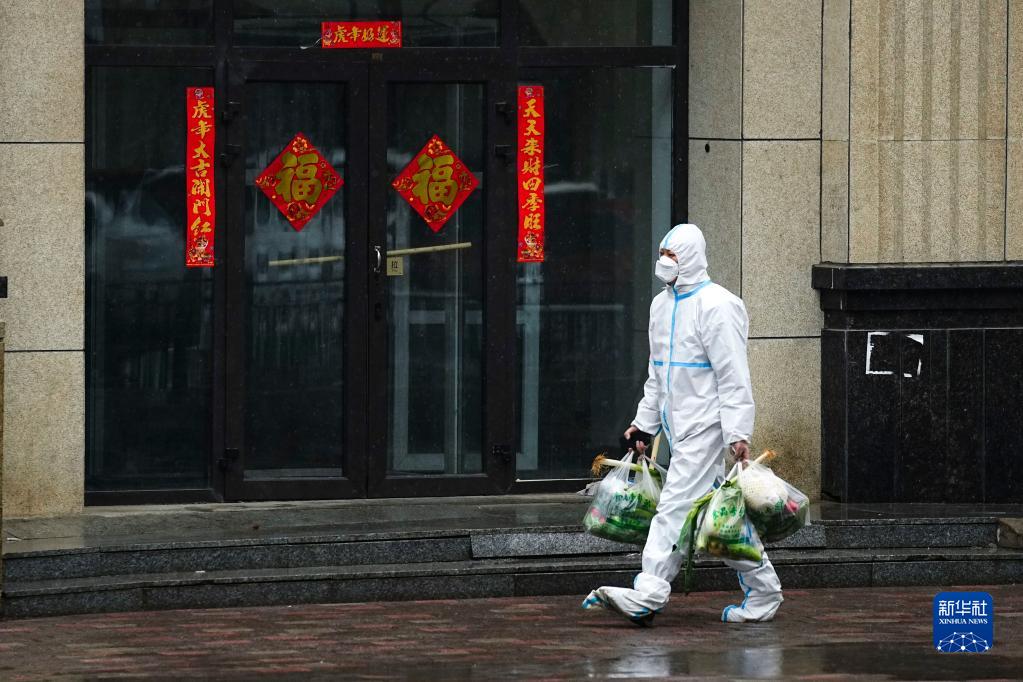 在吉林省長(zhǎng)春市一處管控小區(qū),社區(qū)工作人員為居民配送生活物資(3月29日攝)。新華社發(fā)
