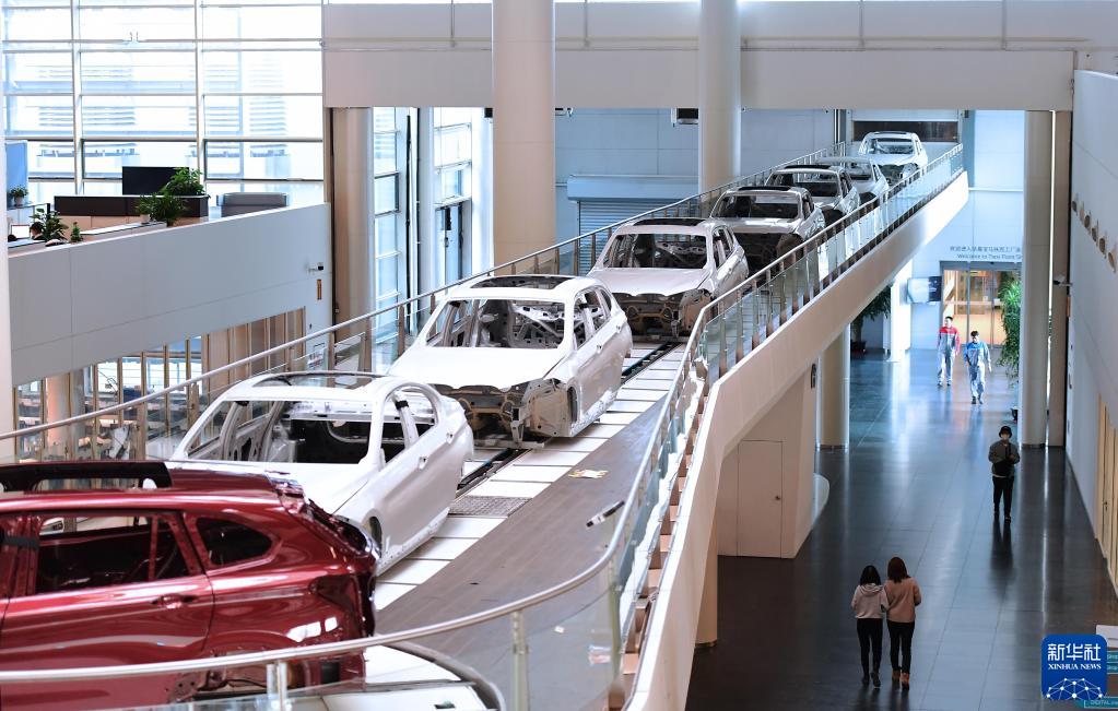 2月16日,在華晨寶馬沈陽鐵西工廠,生產中的車輛穿過辦公區。新華社記者 楊青 攝