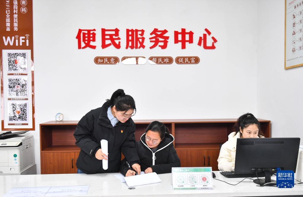 在山西省汾西縣僧念鎮(zhèn)段村,村黨支部書記李佳莉(中)在村委會(huì)處理事務(wù)(1月27日攝)。 新華社記者 柴婷 攝
