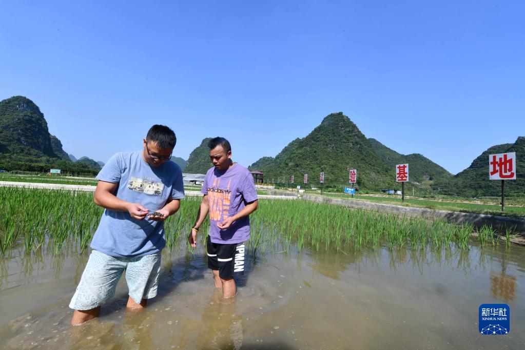 在柳州市柳江區里高鎮板六村螺螄養殖基地,技術人員在查看螺螄生長情況(2021年6月6日攝)。新華社記者 黃孝邦 攝