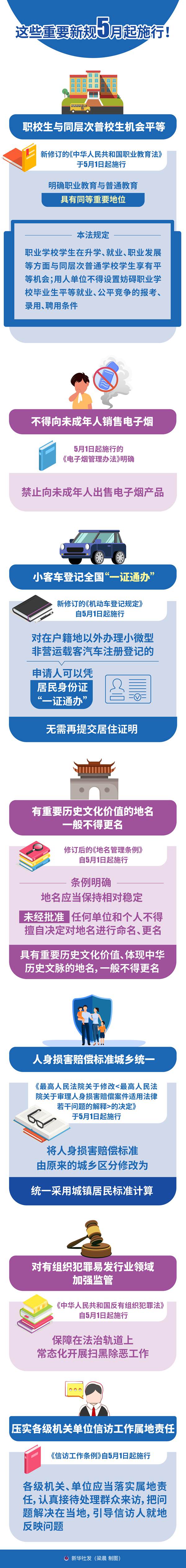 新華社北京4月30日電 題:職校生與同層次普校生機會平等、嚴禁向未成年人銷售電子煙、小客車登記全國“一證通辦”……這些重要新規5月起施行!