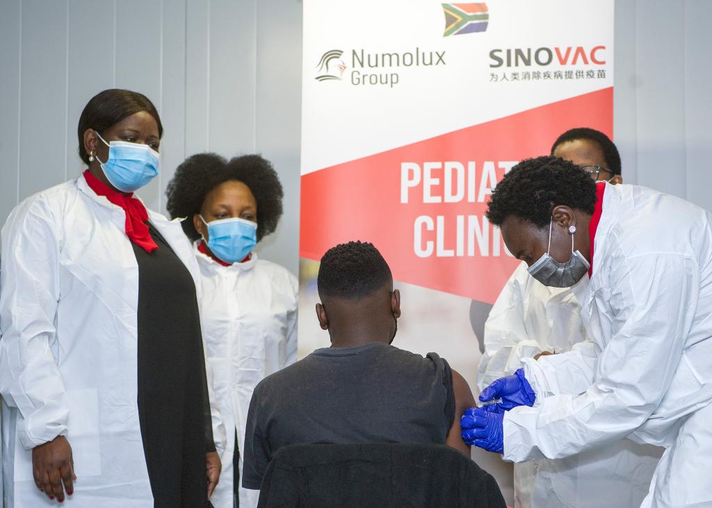 2021年9月10日,在南非比勒陀利亞,醫(yī)務(wù)人員給首名青少年志愿者注射第一劑科興疫苗。新華社記者 陳誠 攝
