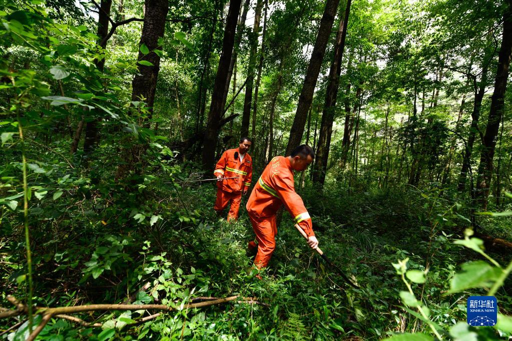 7月13日,在貴陽市長坡嶺國家級森林公園,村級林長郭健(后)與護林員在公園林區巡護。 新華社記者 楊文斌 攝