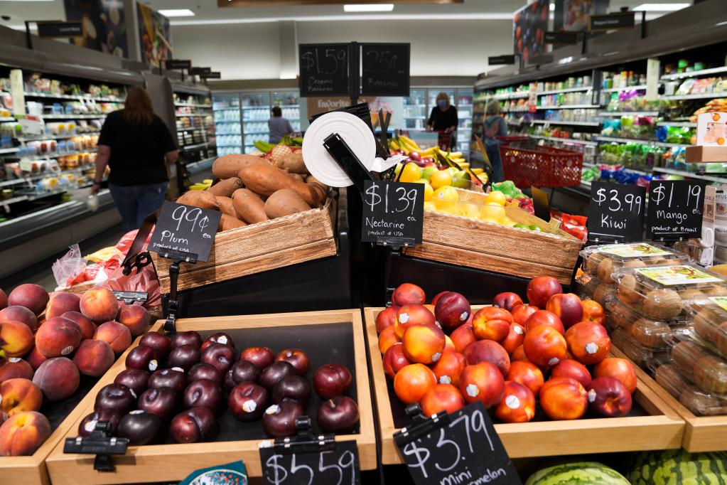 這是7月13日在美國俄勒岡州尤金一家超市拍攝的水果貨架。(新華社記者王迎 攝)