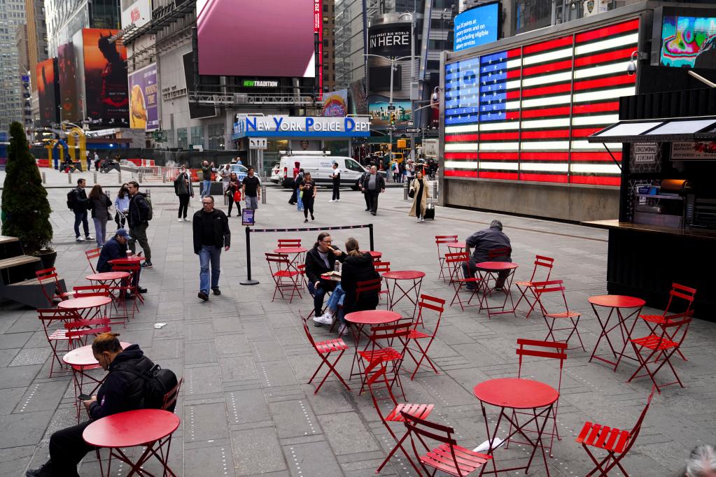 這是2022年3月7日人們在美國紐約時報廣場的資料照片。(新華社記者王迎攝)