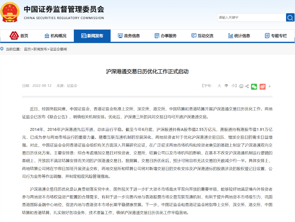 中國(guó)證監(jiān)會(huì)8月12日表示,近日,經(jīng)國(guó)務(wù)院同意,中國(guó)證監(jiān)會(huì)、香港證監(jiān)會(huì)批準(zhǔn)上交所、深交所、港交所、中國(guó)結(jié)算和香港結(jié)算開(kāi)展滬深港通交易日歷優(yōu)化工作。優(yōu)化后,滬深港三所的共同交易日均可開(kāi)通滬深港通交易。