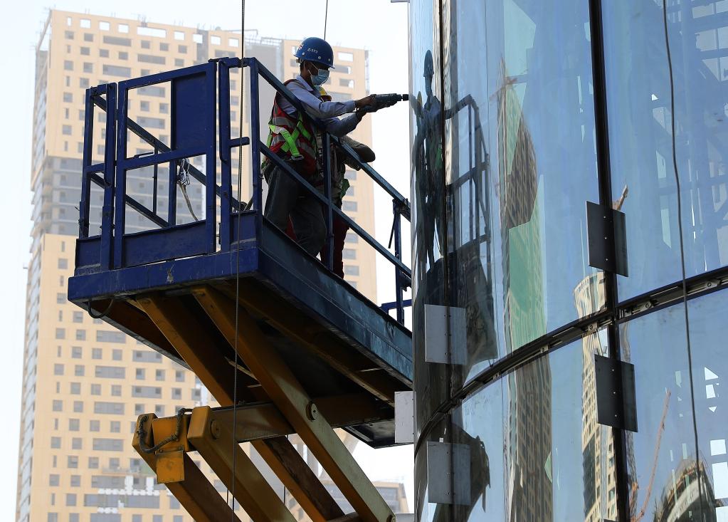 8月17日,工人在埃及新行政首都中央商務區項目現場施工。新華社記者王東震攝