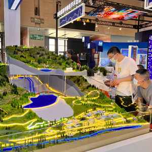 在博覽會上,一個“超級充電寶”的沙盤模型演示了電站如何在用電低谷時將風力和光伏富余的電把水抽到高處、轉化為勢能,待電網高峰負荷時再放水回到下水庫進行發電的過程。這就是位于山西省五臺縣的西龍池抽水蓄能電站。