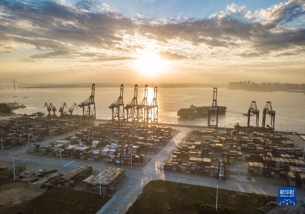 這是2021年12月5日清晨在海南自貿港重點園區洋浦經濟開發區拍攝的洋浦國際集裝箱碼頭(無人機照片)。新華社記者 蒲曉旭 攝
