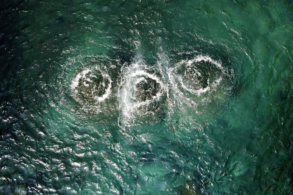 在一方清池中,趵突泉的三股泉水噴涌歡騰(無(wú)人機(jī)拍攝)。(新華社記者徐速繪攝)
