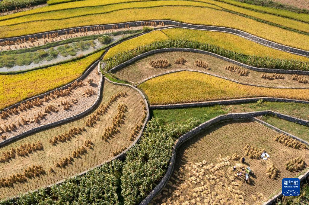 9月19日,在貴州省畢節市百里杜鵑管理區黃泥鄉朝門村,農民在收割水稻(無人機照片)。