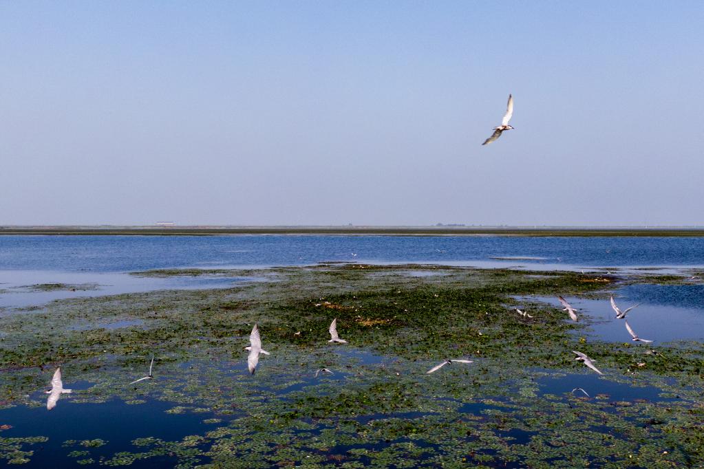 候鳥在湖北省武漢市沉湖生態自然保護區水面上飛翔。新華社記者 伍志尊 攝