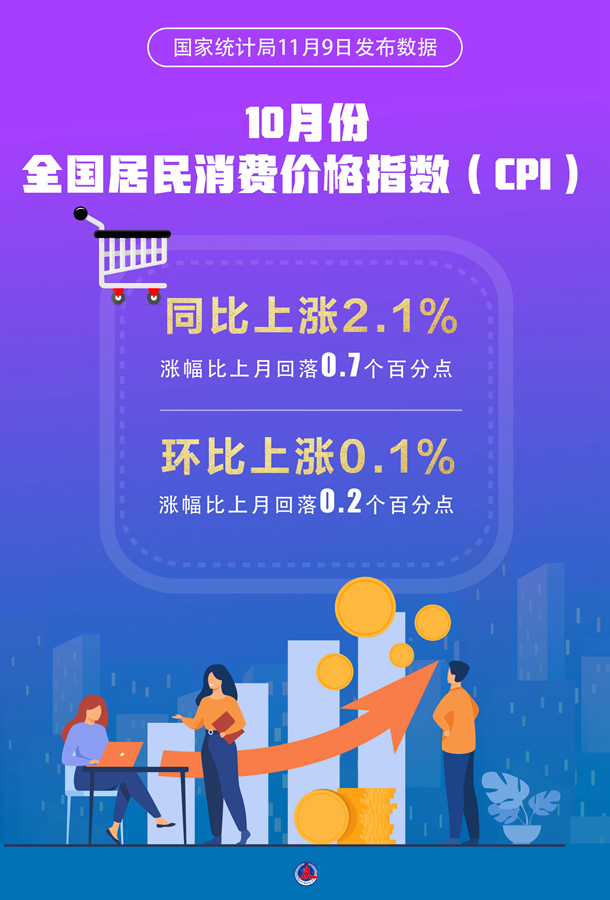 新華社北京11月9日電(記者魏玉坤)國家統計局9日發布數據,10月份,全國居民消費價格指數(CPI)同比上漲2.1%,漲幅比上月回落0.7個百分點;環比上漲0.1%,漲幅比上月回落0.2個百分點。