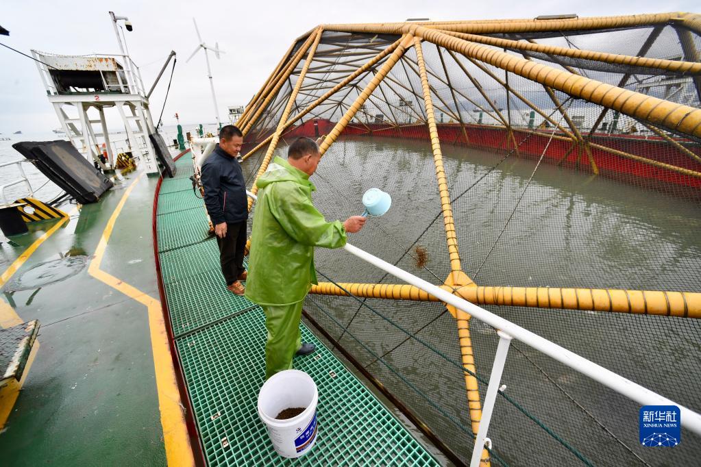 福建省連江縣定海灣內(nèi)的“振漁1號”深遠(yuǎn)海養(yǎng)殖平臺上,工作人員在為養(yǎng)殖大黃魚投喂飼料(11月15日攝)。