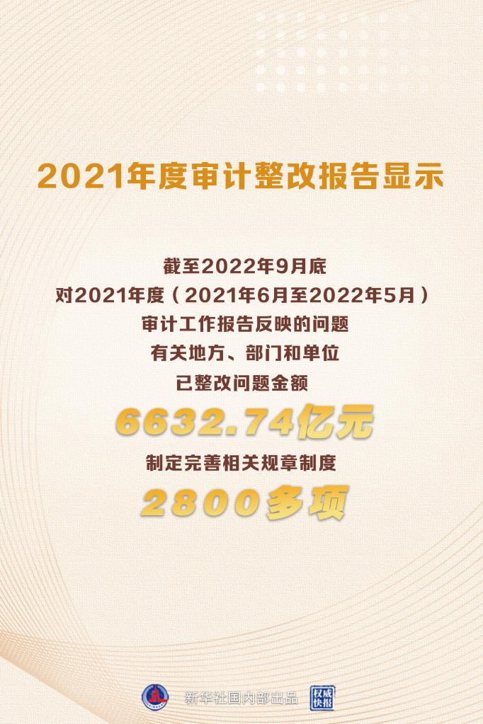 新華社北京12月28日電(記者鄒多為)報告顯示,截至2022年9月底,對于2021年度(2021年6月至2022年5月)審計工作報告反映的問題,有關地方、部門和單位已整改問題金額6632.74億元,制定完善相關規章制度2800多項,追責問責1.4萬人,糾治了一些阻礙改革發展和長期未解決的頑瘴痼疾。