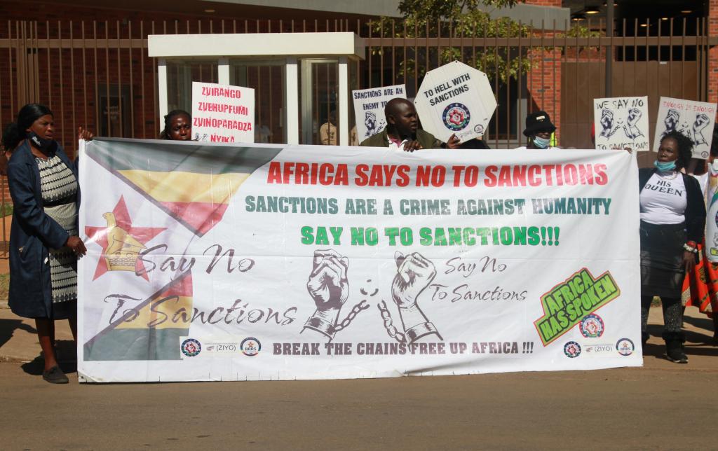 2022年7月4日,在津巴布韋首都哈拉雷的美國駐津使館門前,津巴布韋“廣泛反對制裁聯(lián)盟”組織成員手舉標語牌,反對美國及其西方盟友對津巴布韋的長期經(jīng)濟制裁。新華社發(fā)(塔法拉·穆瓜拉攝)