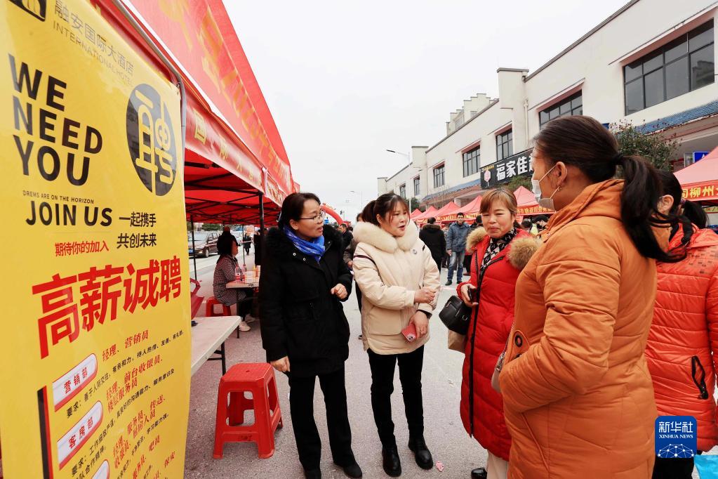 2月10日,在廣西融安縣易地扶貧安置點(diǎn)融康社區(qū),求職者和招聘人員在交流。新華社記者 黃孝邦 攝